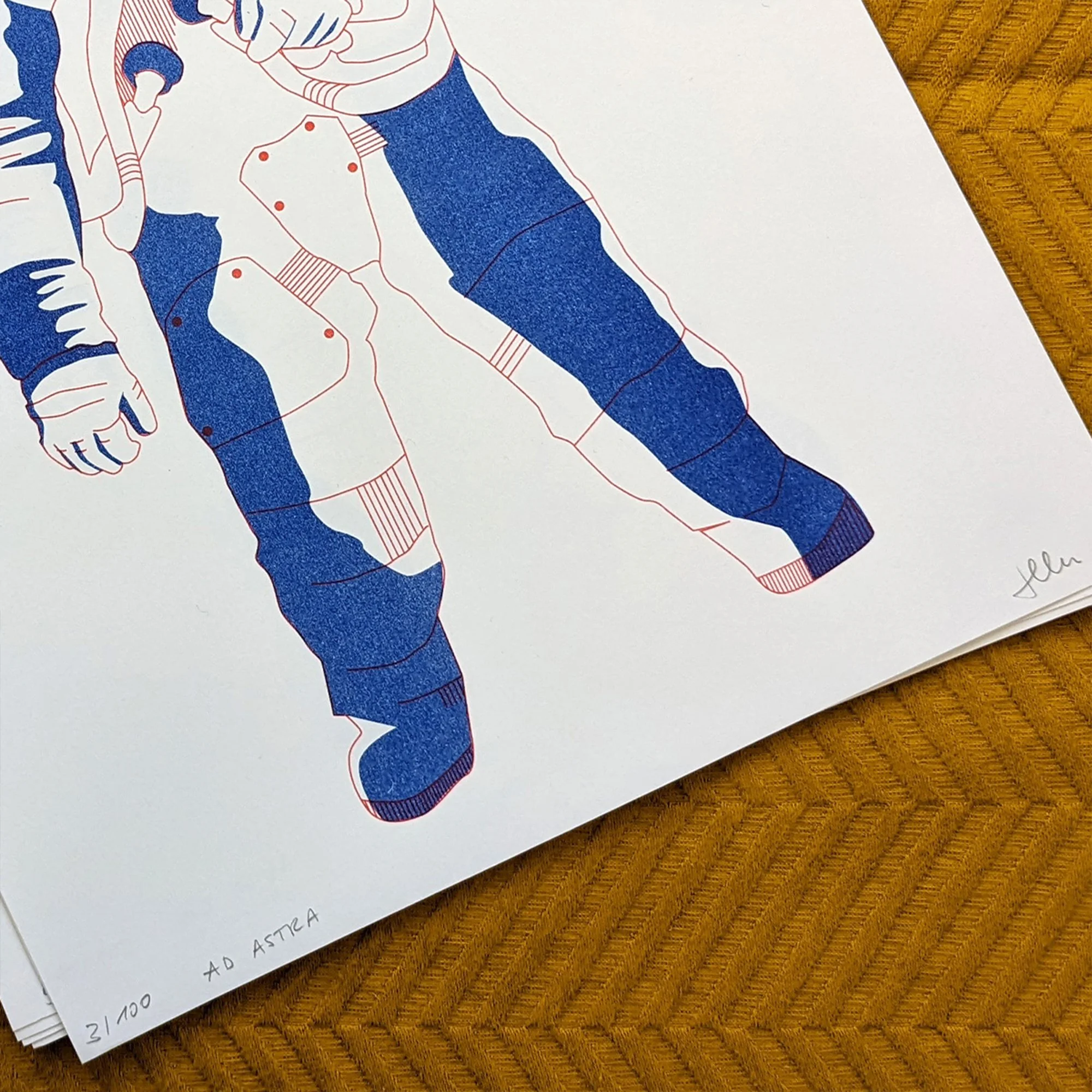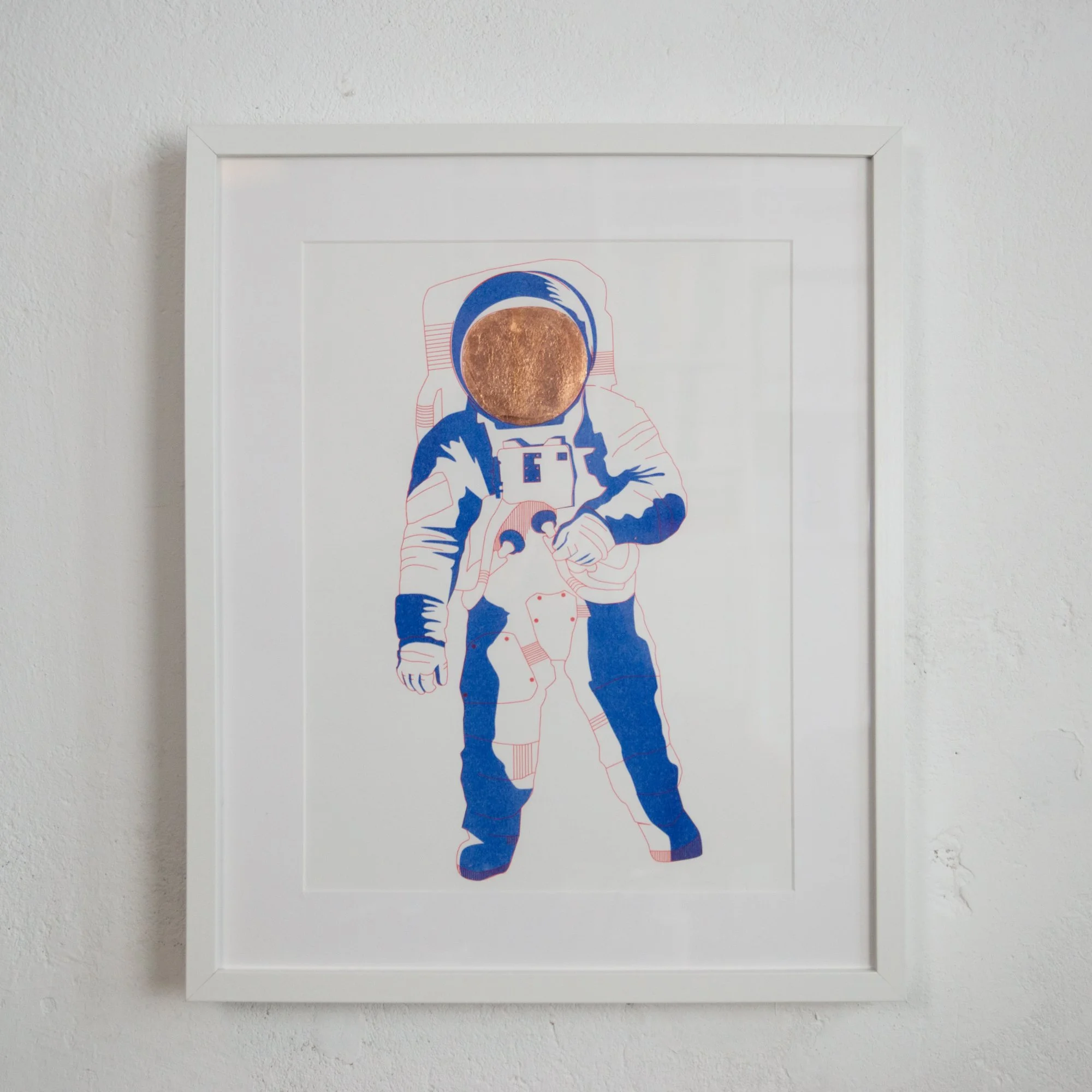 Die Veredelung: In einer Auflage von 100 Exemplaren wurde jedes Blatt einzeln von Hand bearbeitet. Das Visier des Raumhelms ist mit Blattkupfer belegt. Dieses metallische Element bricht mit der matten Ästhetik der Riso-Farben und reflektiert die Umgebung des Betrachters.